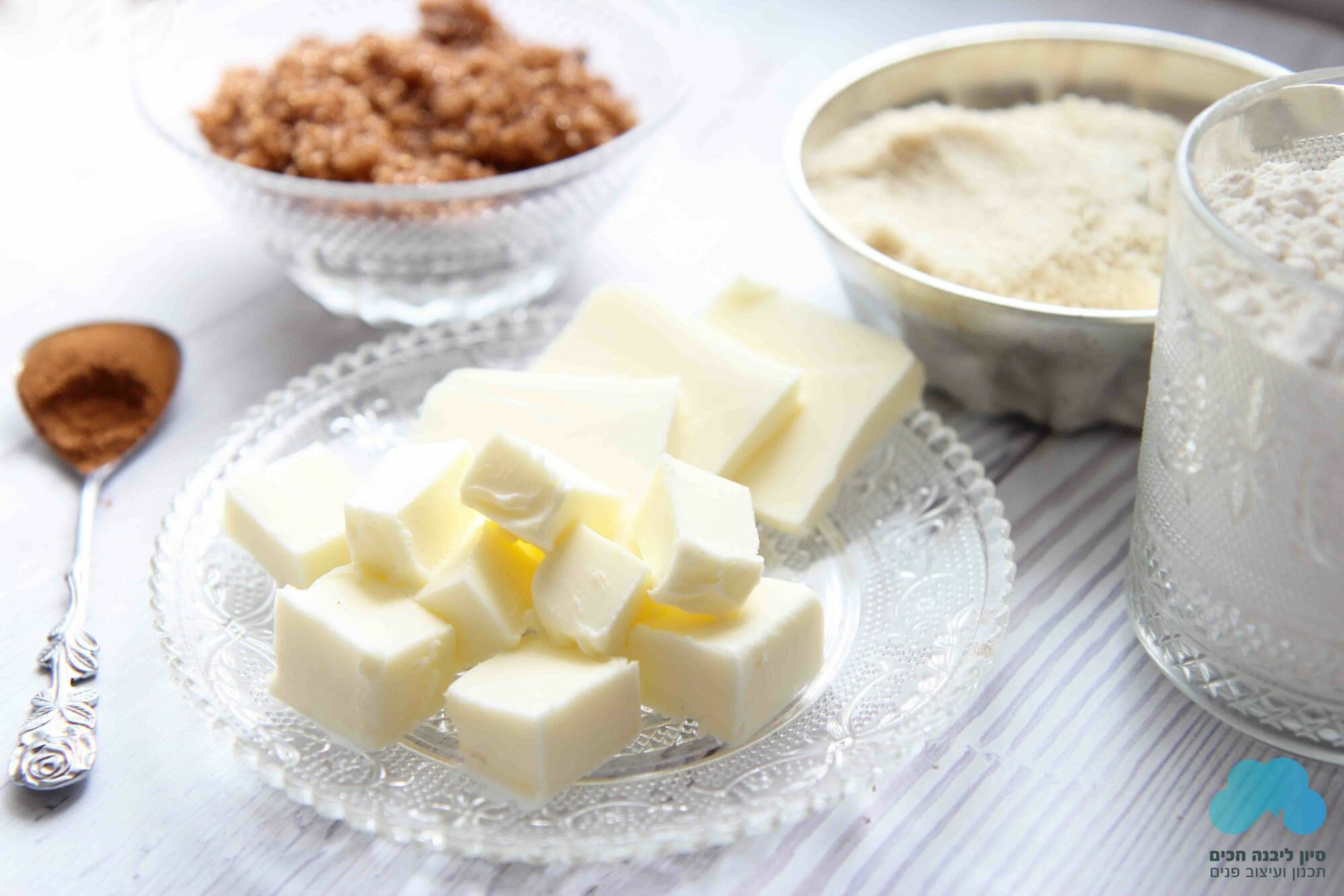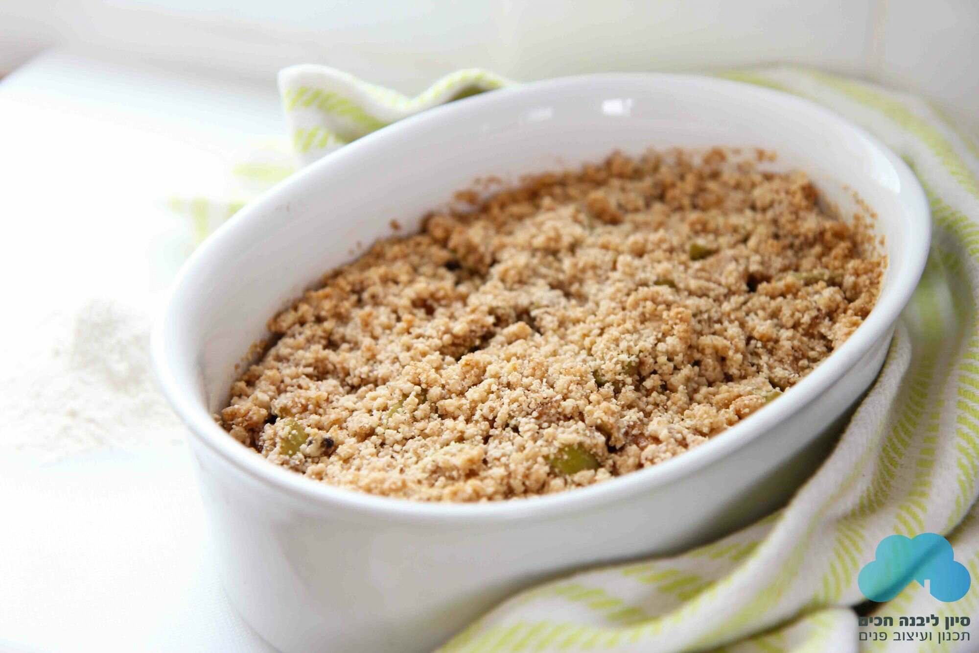 4. הכינו שטרויזל: 1/2 כוס סוכר חום + 100 גרם חמאה קרה חתוכה לקוביות + 1 כוס קמח תופח + 1/2 כוס שקדים טחונים.