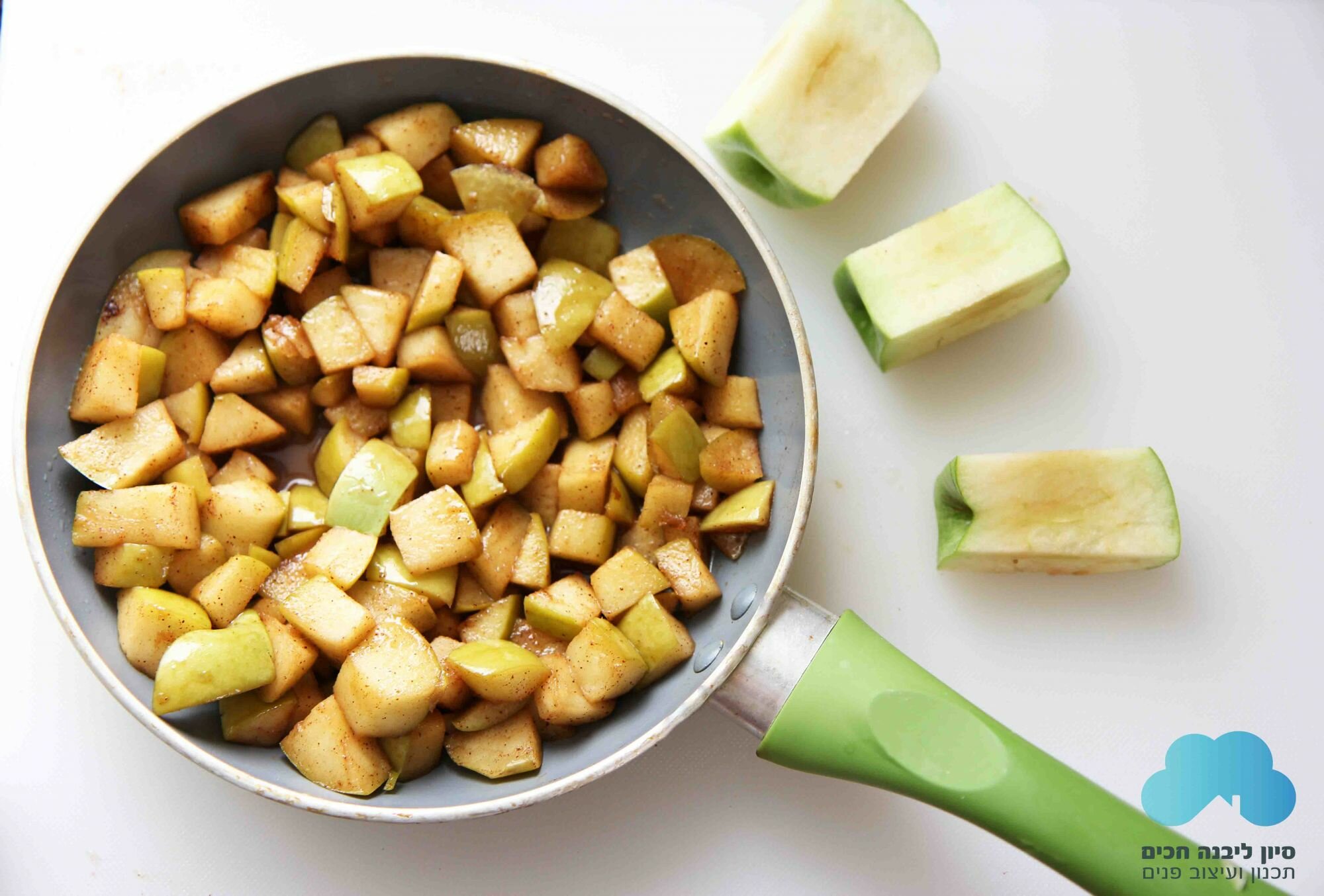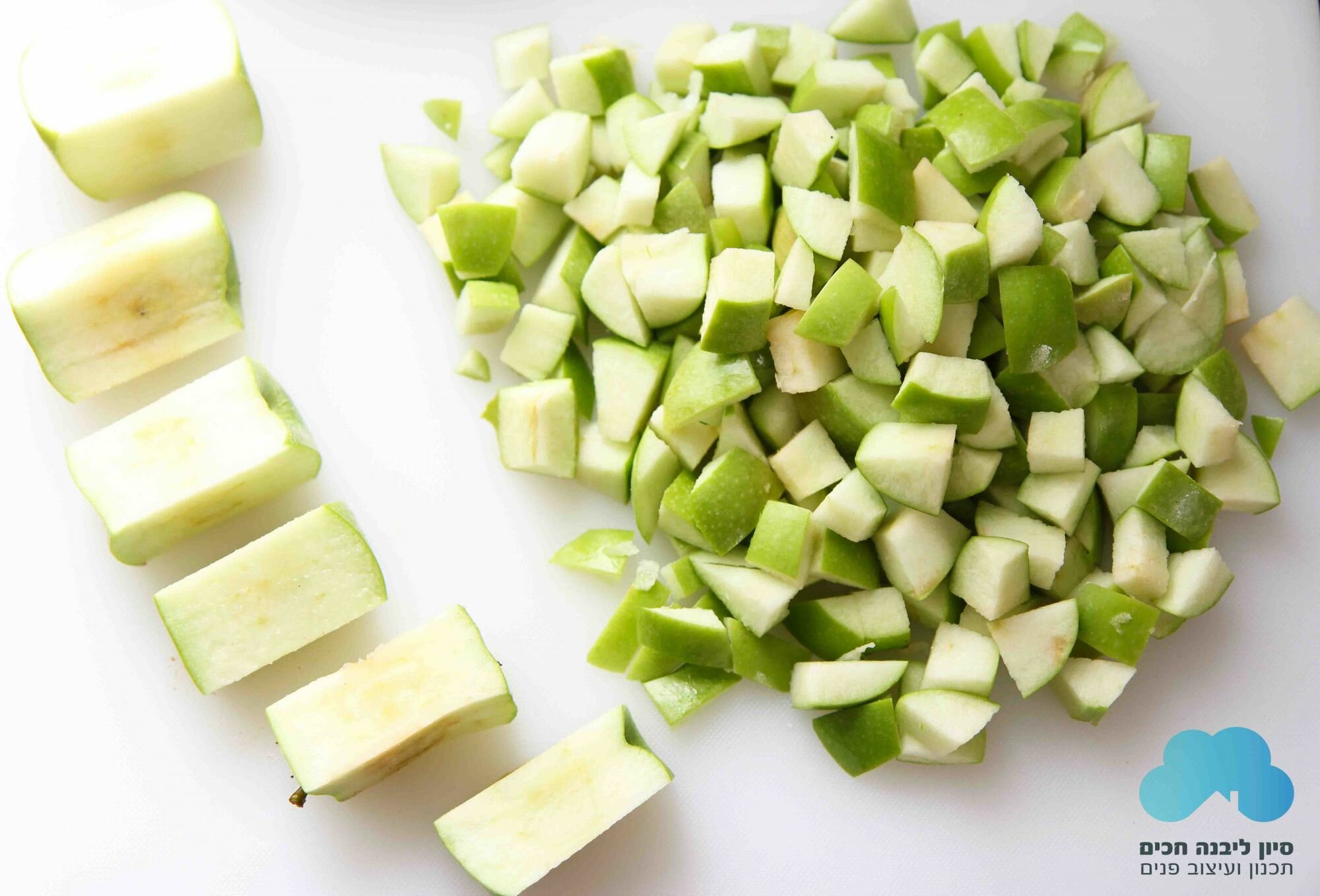 1. חתכו תפוחי גרנד סמית לקוביות גדולות (כמה תפוחים? לפי גודל התבנית. אני השתמשתי כאן בתבנית קטנה וחתכתי 6 תפוחים)