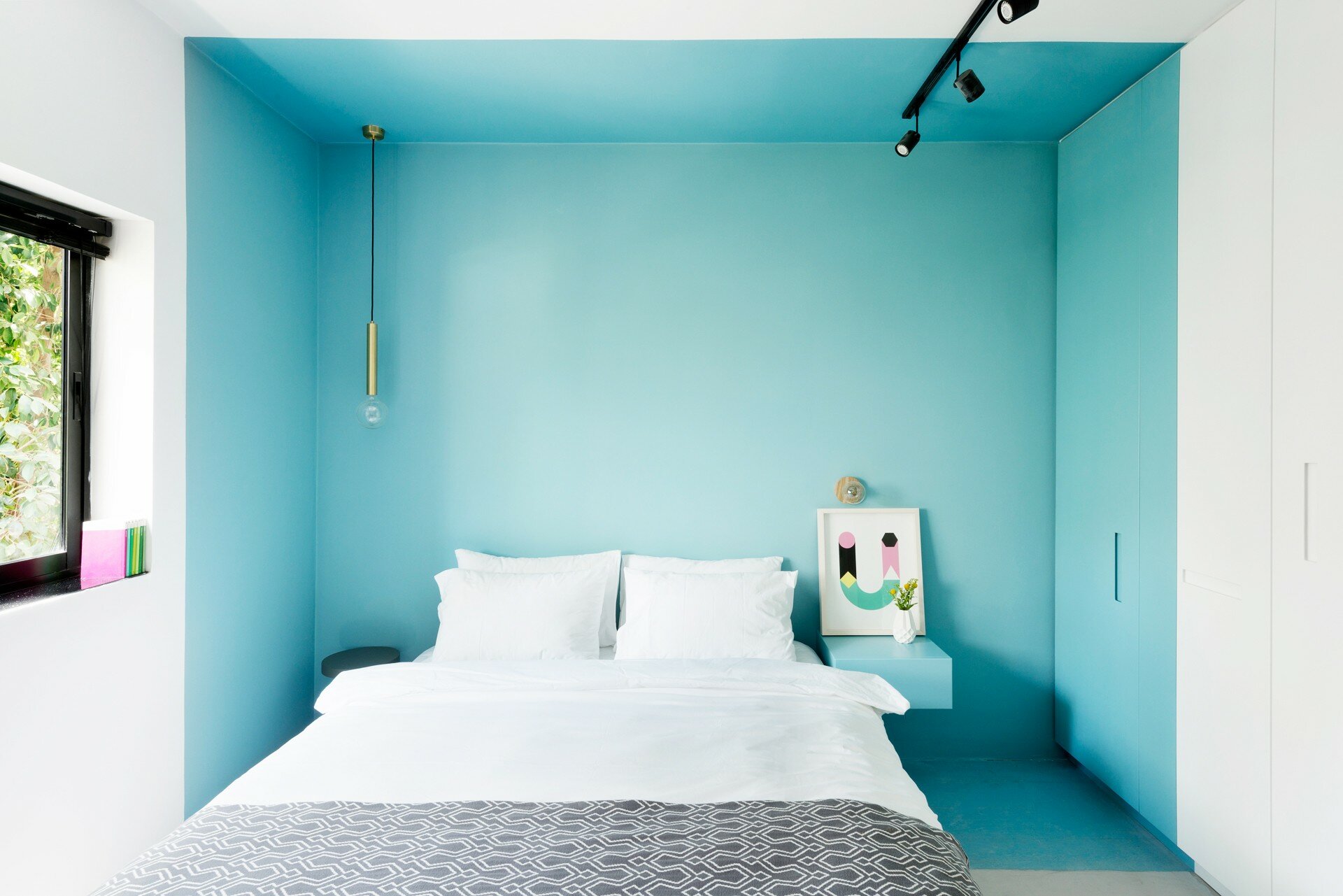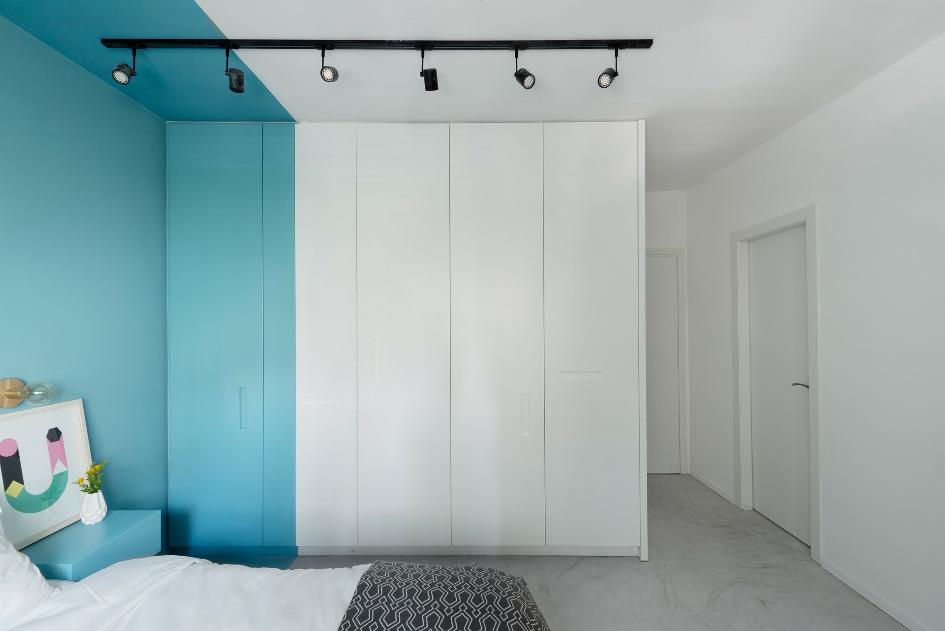 בחדר השינה צבענו את אזור גב המיטה בגוון טורקיז שנותן מראה רענן ונעים. כתם הצבע גלש מהקיר אל הרצפה ונמשך לאורך דלת ארון הבגדים. תוכננה מיטה זוגית לבנה ומרחפת והשידה הצמודה למיטה נצבעה גם היא בגוון הטורקיז להשלמת הרצף.