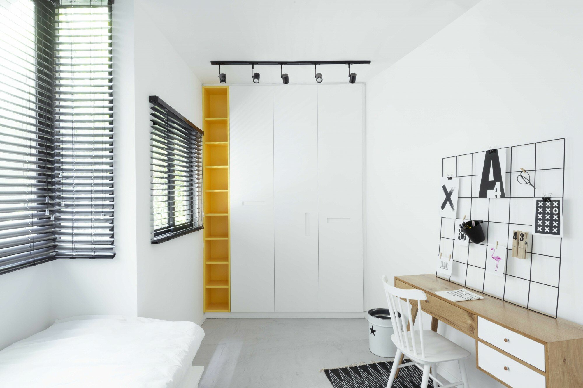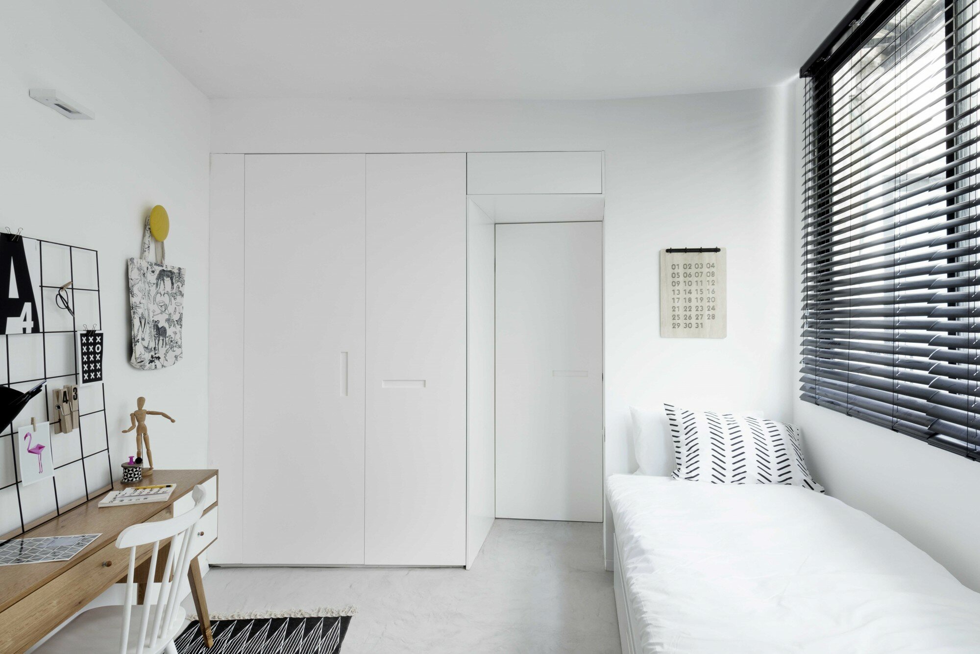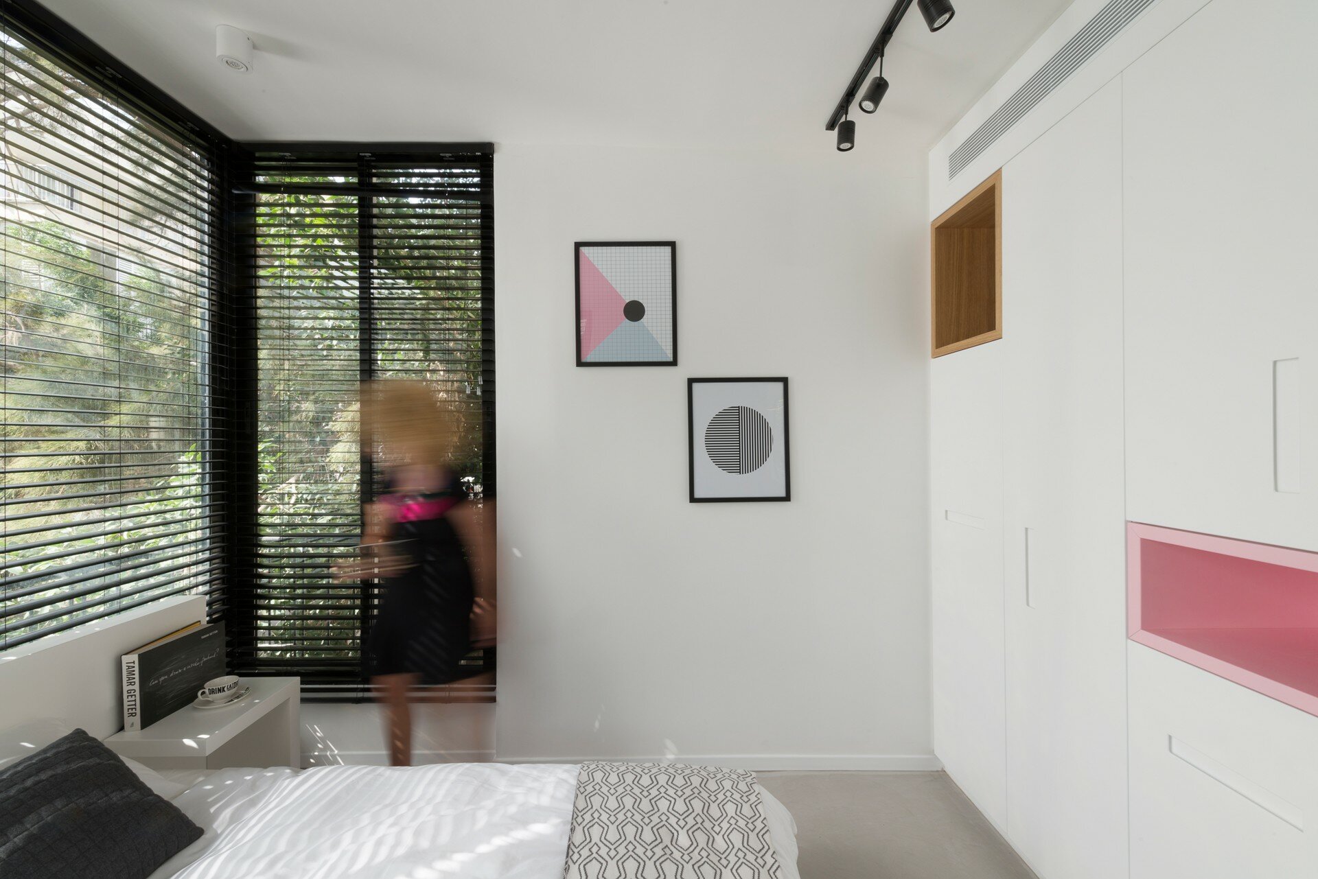 החדר מוקם במקום של המטבח הישן. זה החלל הכי קטן בדירה וכדי להגדיל את תחושת המרחב תוכננו פריטי נגרות לבנים הכוללים מיטה נפתחת, ארגז אחסון, שני ארונות שבאחד מהם שולבה ספריה צהובה.