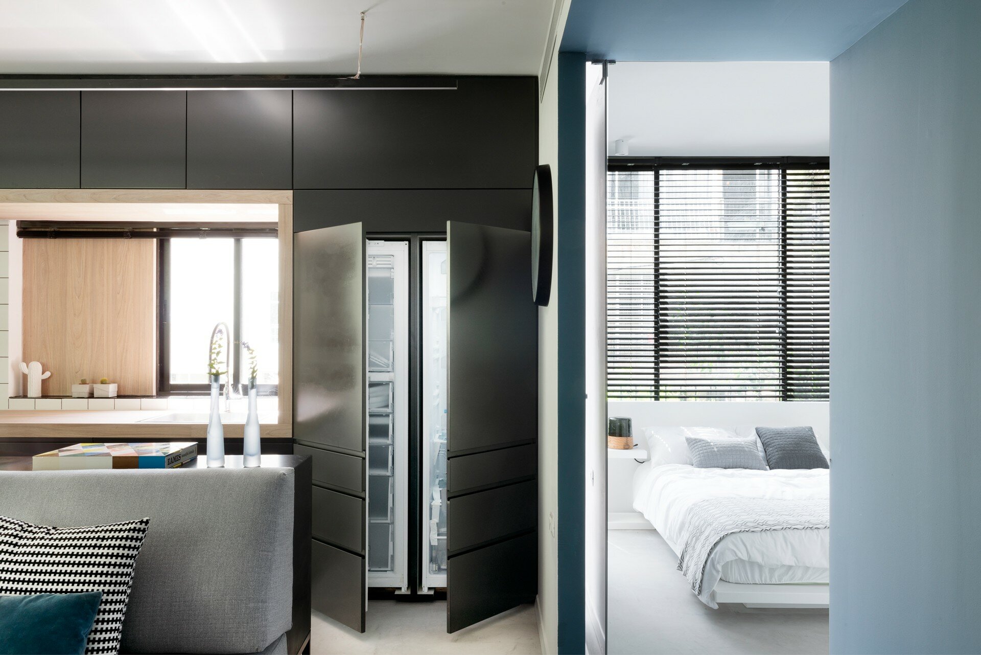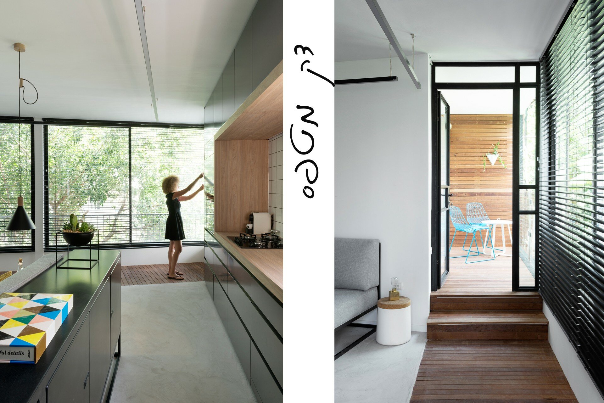 המחשבה הייתה לייצר חלל ציבורי רחב, פתוח ומואר שיכלול סלון ומטבח. לכן, בשלב הראשון שונה מיקום המטבח המקורי לאזור החלל המרכזי ויצרנו מטבח גדול ומאוורר. לאחסון מירבי במטבח תוכננו ארונות מהרצפה לתקרה והוצב דלפק אלומיניום בצבע שחור שמשמש כמרחב עבודה, אחסון נוסף ומהווה חציצה בין המטבח לאזור הסלון ותוחם אותם.