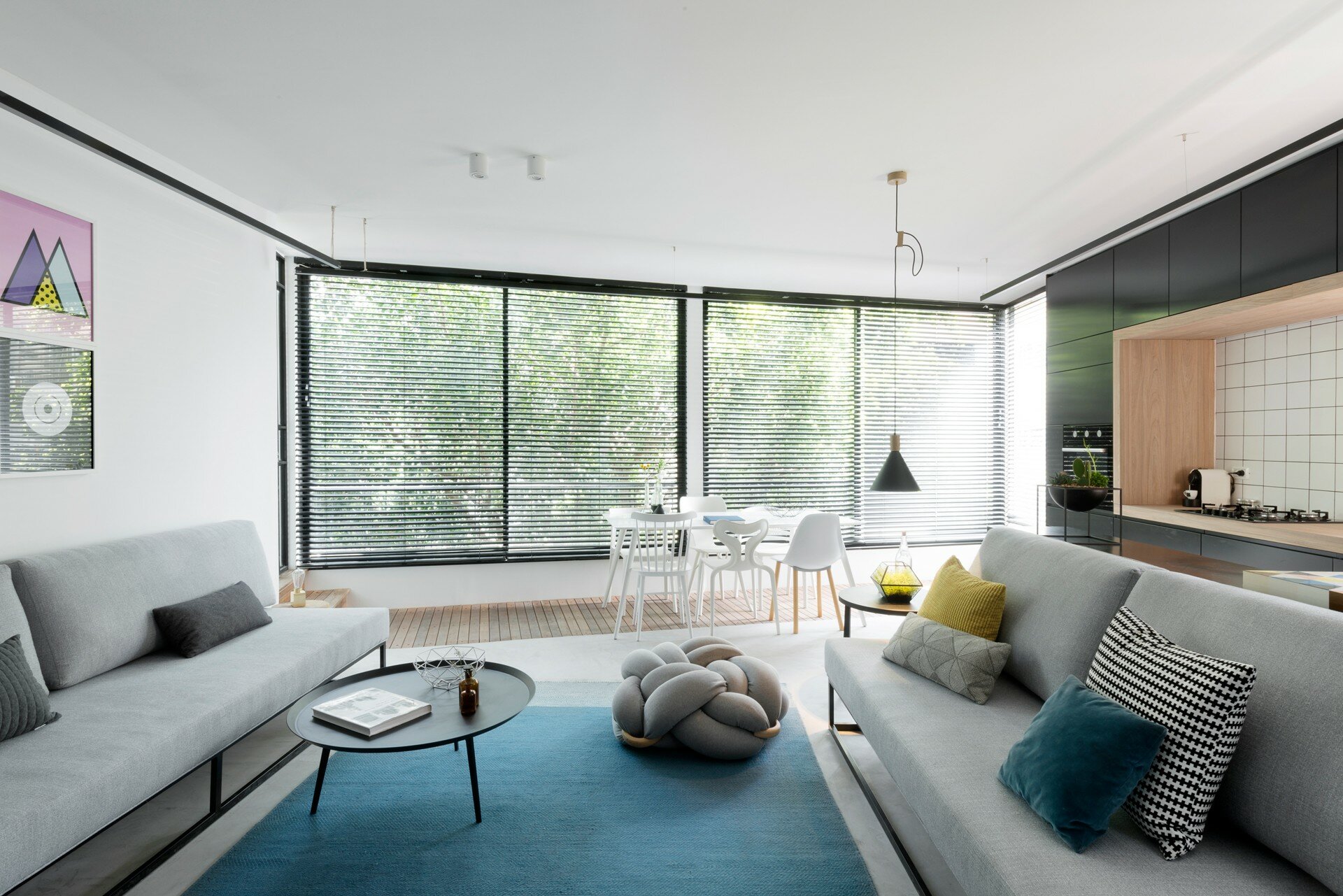 כדי לתת תחושה של חלל מרכזי רחב עם מרפסת גדולה הודגש בחלל הציבורי אזור ה"דֶק" שממשיך מהמרפסת החיצונית ועד פנים הדירה. נבנו שתי מדרגות והותקנה לאורכן תאורה סמויה לתחושה של הפרדה ויצירת מפלס חדש. רצפת העץ ממשיכה ומטפסת על גבי קיר המרפסת ברצף ויוצרת תחושה של מרפסת גדולה ומרווחת יותר שמשתלבת עם הצמחייה הירוקה העוטפת את הבית.