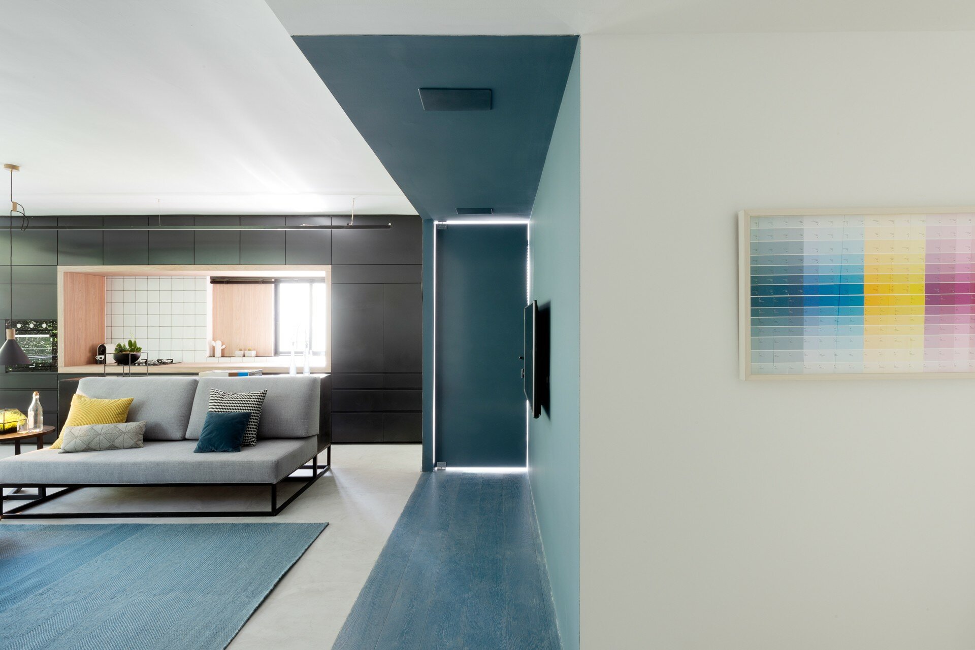 קיר הטלויזיה נצבע בצבע כחול וכמו כן התקרה שמסביבו, הרצפה והדלת שמובילה לחדר. יצרנו בעצם נישה שתוחמת אזור. אלמנט שחוזר על עצמו בדירה בגוונים אחרים.
