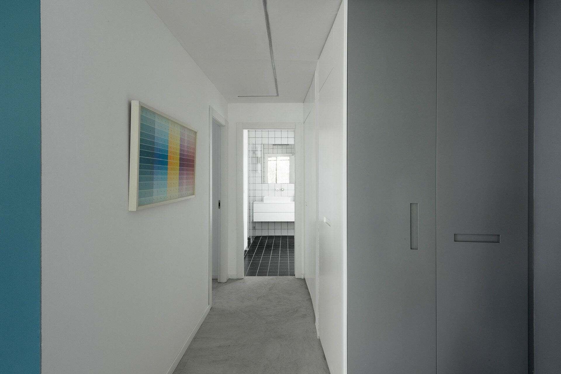 נבחרה לדירה רצפת מיקרוטופינג בהירה בגוון אפור בהיר. במקומות בהם הופיעו נישות הצבע, רצפת המיקרוטופינג הוחלפה בפרקט עץ שנצבע בגוון תואם לגוון הנישה המיועדת.
