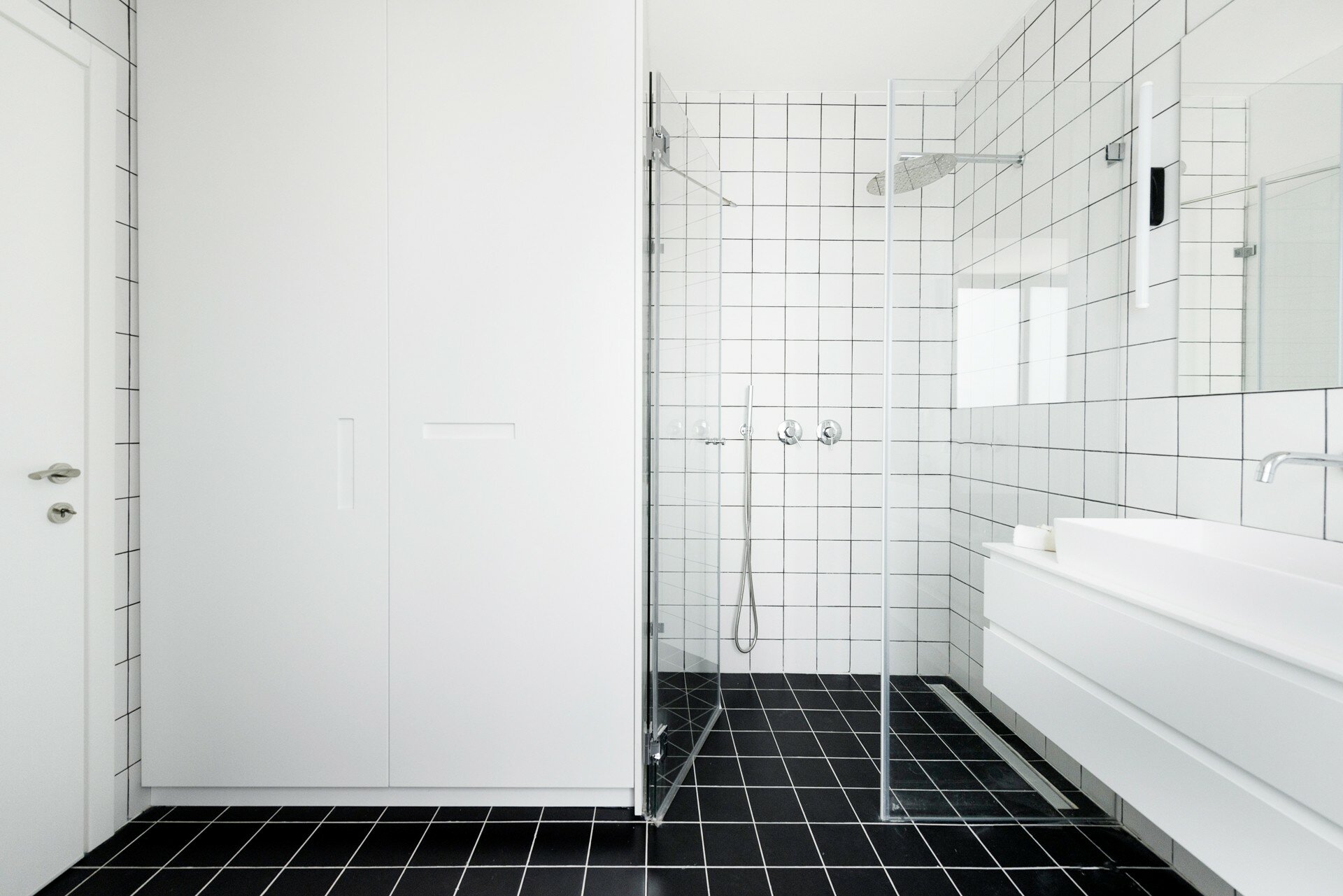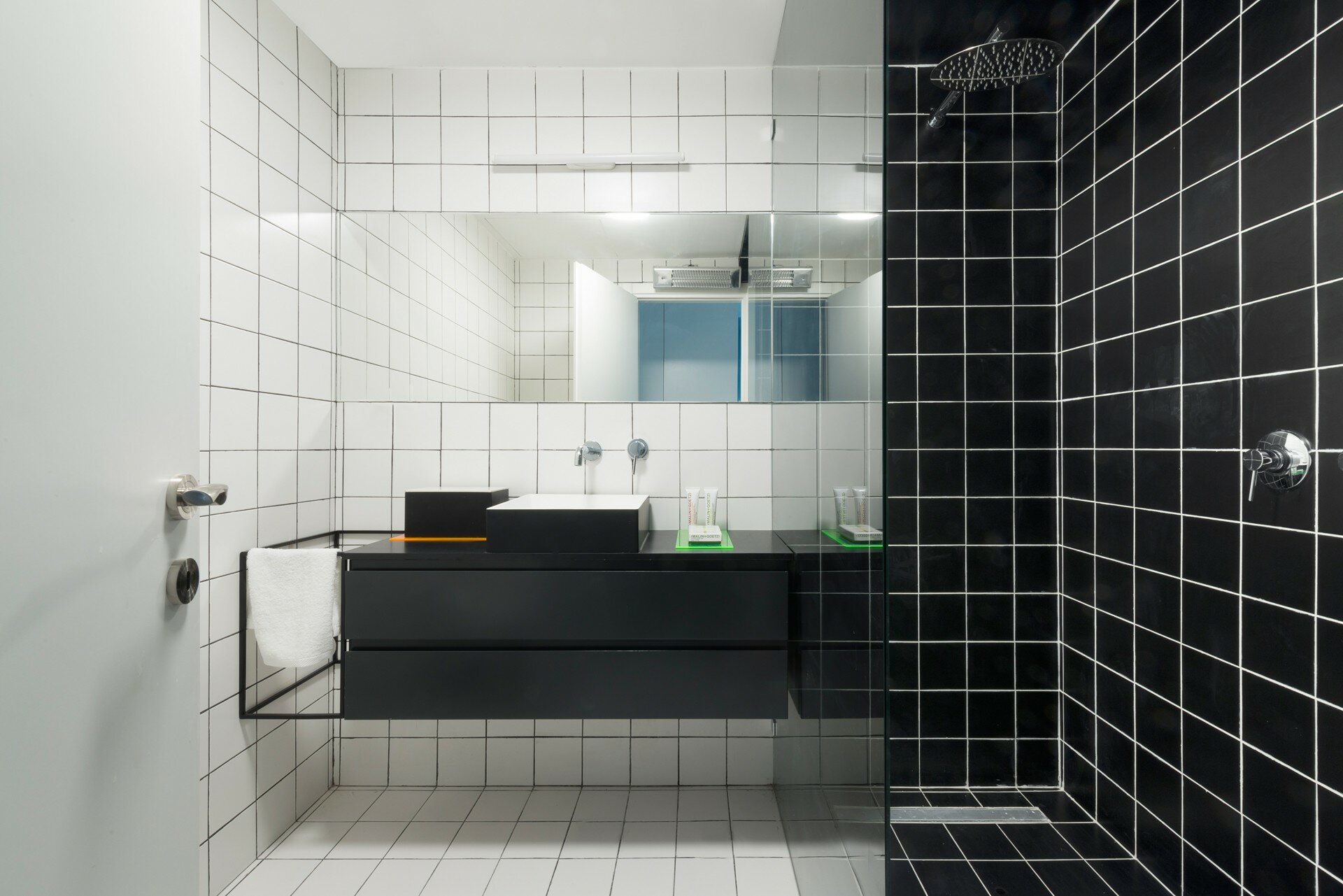 בדירה תוכננו 2 חדרי רחצה גדולים ומפנקים. בחדר רחצה ראשי, בדומה למטבח, הוחלט להבליט את הקרמיקות ואת הקונטרסט בין הצבעים על ידי צבע מנוגד של הרובֶה בין האריחים. נבחר חיפוי לבן מרובע לקירות וריצוף מרובע שחור לרצפה. תוכננה שידת כיור מעץ בשילוב של פרזול שחור (קוביית מסגרות שחורה באזור העמוד). יש תחושה שהארונית ממש "מחבקת" את העמוד.