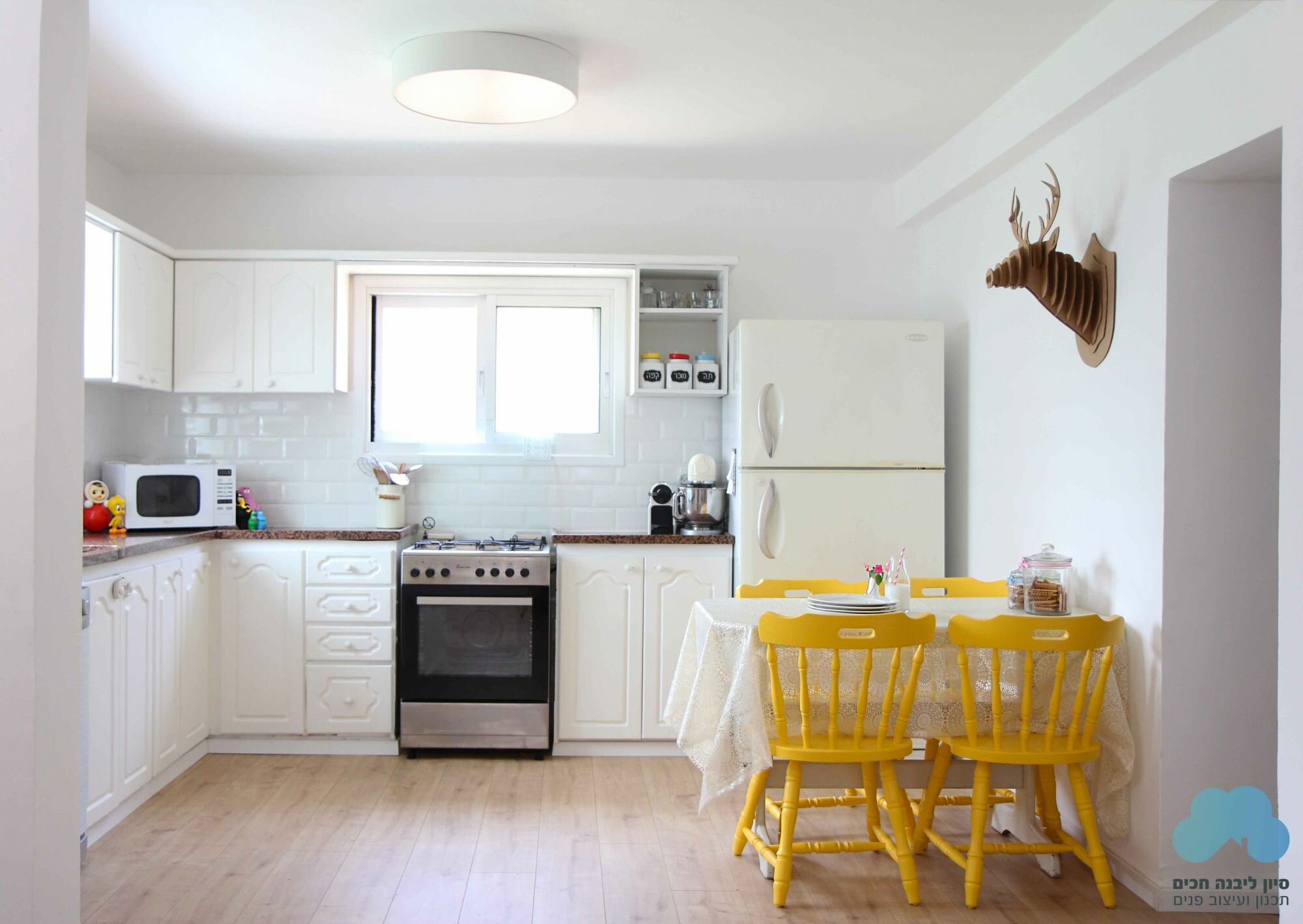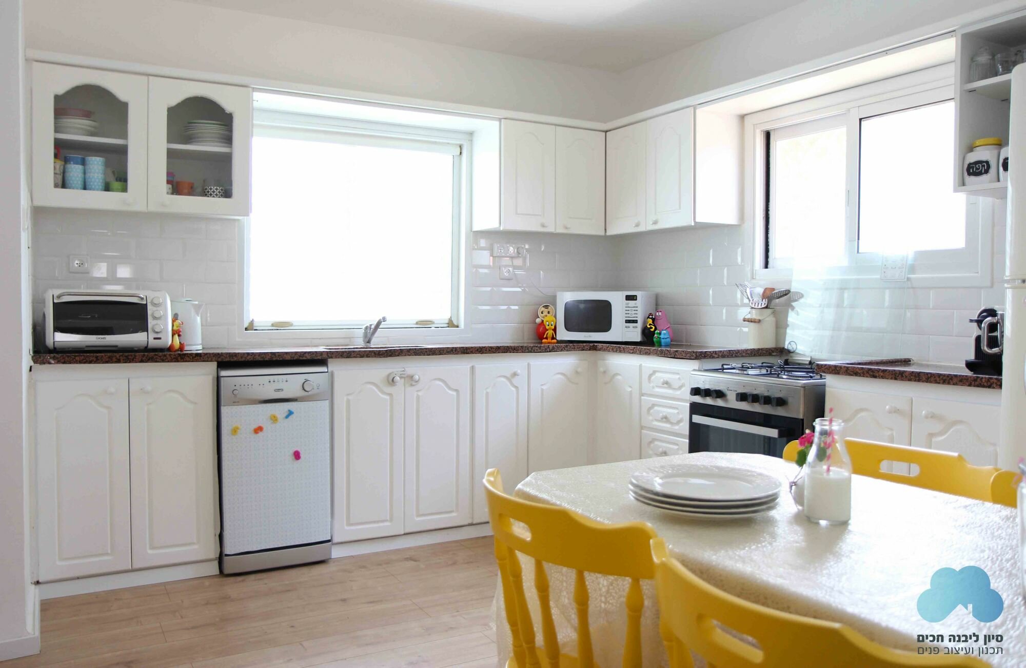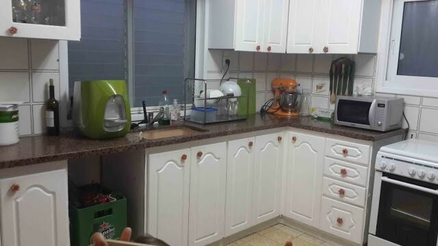 את המטבח צבענו בגוון לבן, החלפנו ידיות, וכמו שאתם יודעים החלפתי את החיפוי .(מוזמנות לקרוא בפוסט הקודם). על המדיח האפור הדבקתי מדבקה גאומטרית בגווני לבן ותכלת ששדרגו אותו בין רגע.