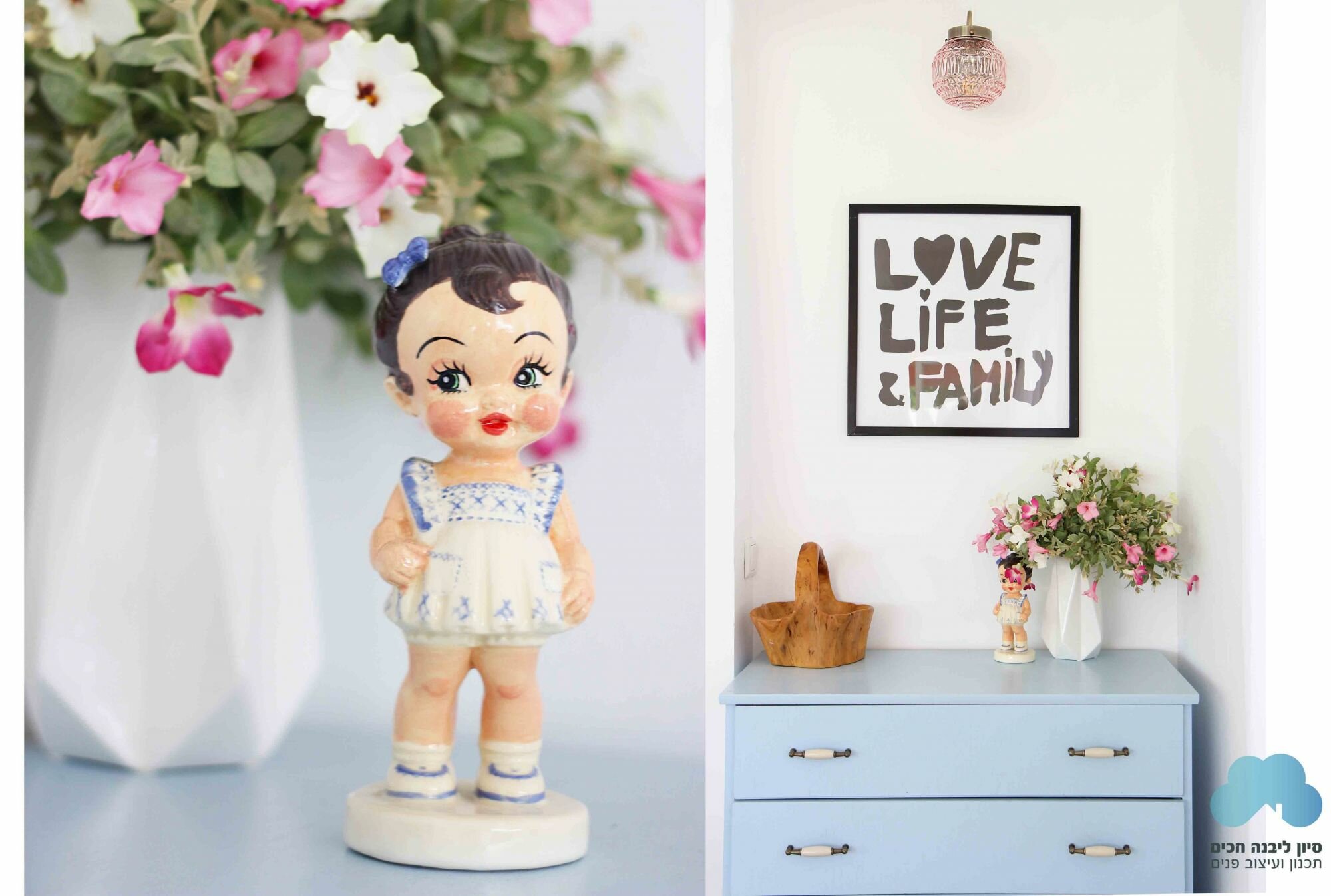 בובה מהממת מבית "פוגי נעים" המוכשרת הונחה על שידת הכניסה הכחולה.