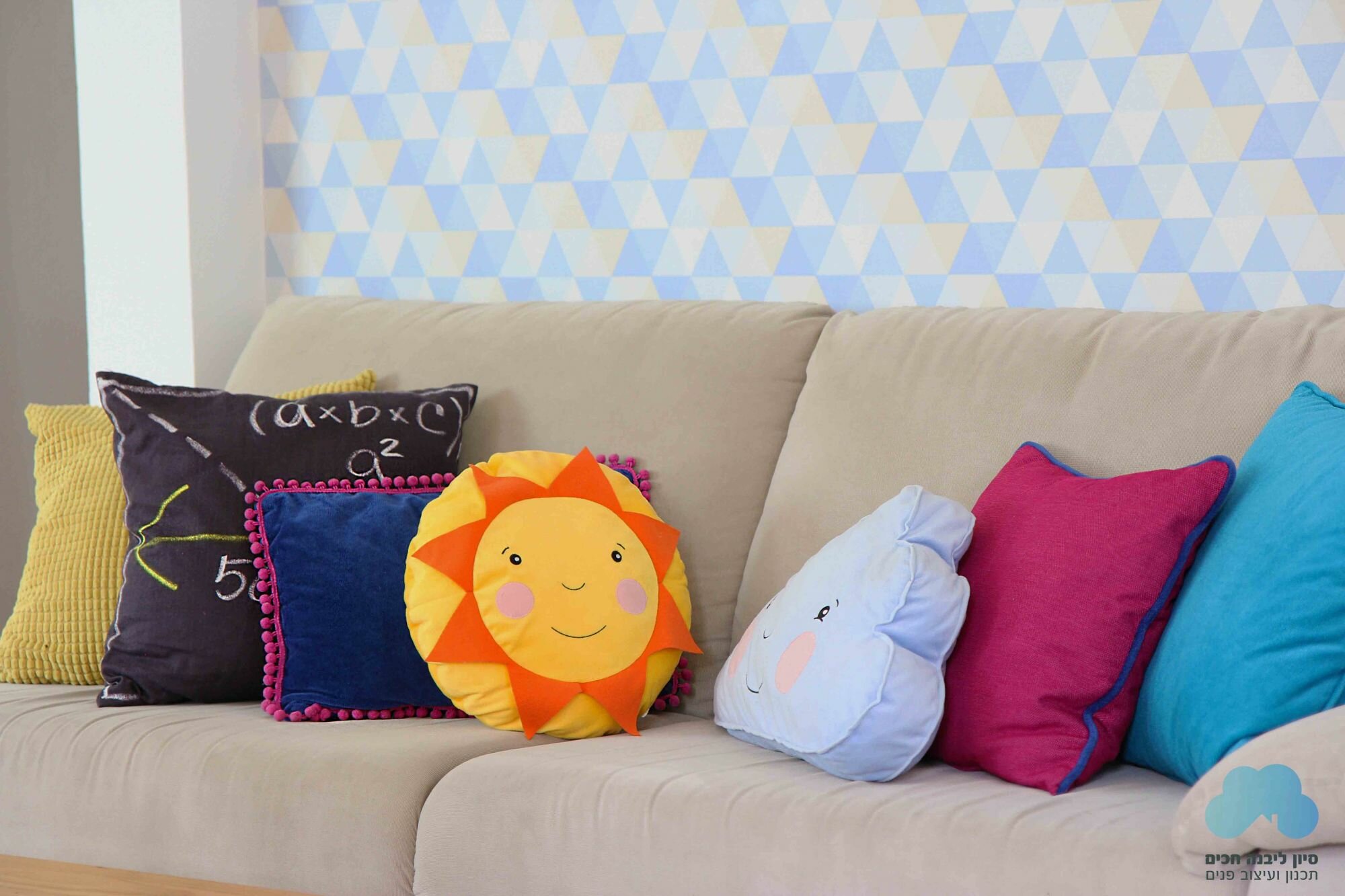 הספה שלנו שמורכבת משזלונג וחלק של תלת לא התאימה לדירה בשלמותה. החלטנו לפצל אותה ל-2 חלקים. החלק של התלת ממוקם בסלון והשזלונג במרפסת שבגינה. חדי האבחנה ישימו לב שיש משענת לידיים רק בצד הימני של הספה בסלון. כדי לטשטש את העובדה שאין משענת בשני הצדדים השתמשתי בכריות. והמון. תירוץ מעולה להוסיף טקסטיל צבעוני ומשמח.